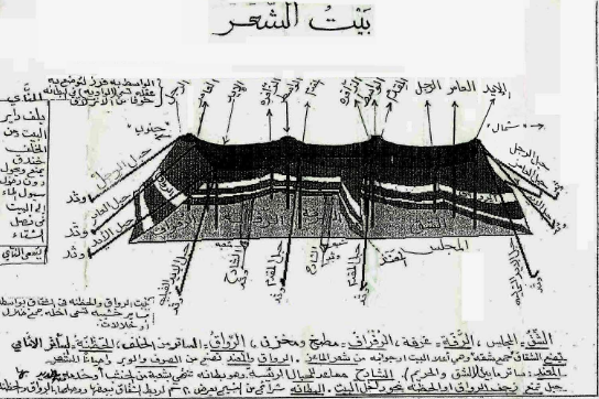 - الأعمدة: وهي مصنوعة من خشب الاثل أو الطلح وطولها من المترين إلى مترين ونصف ووظيفتها رفع بيت الشعر .